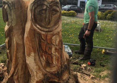 When we lost a tree that was no longer safe, our local County Cllr’s asked for enough of the tree stump to be left so that something could be done with it.  After contacting a local sculptor (Richie Barnes) who specialises in chainsaw carvings he came up with the design of two owls and wizard.  Richie gave his time for free, the Parish Council paid for the materials and the County Cllr’s paid for the flower beds.  The feature has received some fantastic responses from local residents.